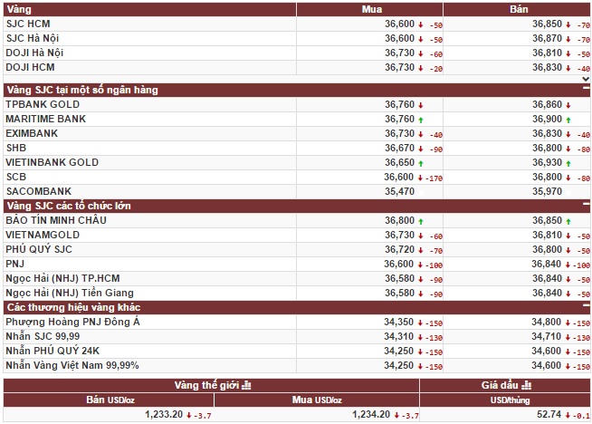 Công ty vàng bạc đá quý Sài Gòn niêm yết ở mức 36,59 triệu đồng/lượng (mua vào) và 36,86 triệu đồng/lượng (bán ra), giảm 60 ngàn đồng/lượng chiều mua vào và giảm 80 ngàn đồng chiều bán ra so với cuối giờ chiều ngày 2/3.
