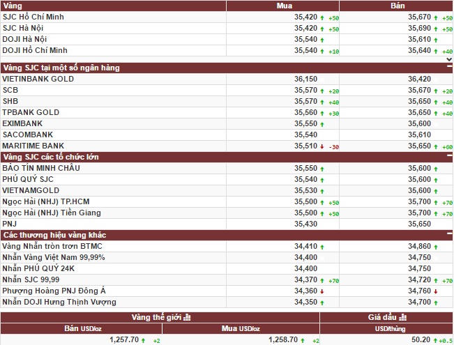 Cùng thời điểm, Công ty vàng bạc đá quý Sài Gòn niêm yết giá vàng miếng SJC tại TP HCM ở mức 35,42 triệu đồng/lượng (mua vào)và 35,67 triệu đồng/lượng (bán ra), tăng 50.000 đồng/lượng ở cả 2 chiều mua và bán so cuối giờ chiều 17/10.