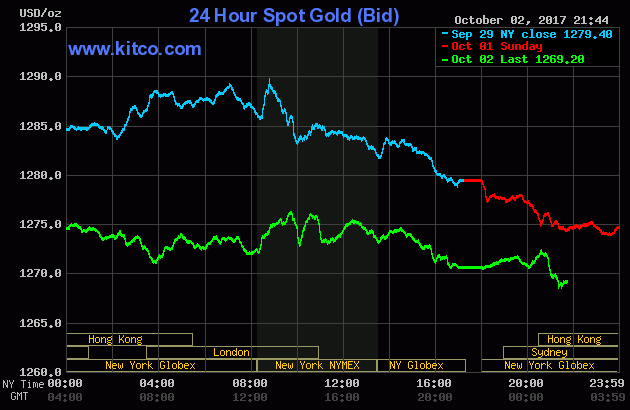 Theo đó, giá vàng giao tháng 12 kết phiên 2/10 giảm 9 USD, tương đương 0,7%, xuống 1.275,80 USD/ounce – mức thấp nhất kể từ 8/8. Dù giảm 1% trong tuần trước và 2,7% trong tháng 9, nhưng giá vàng vẫn tăng khoảng 3,6%.