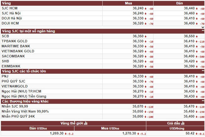 Giá vàng miếng trong nước được Tập Đoàn Vàng bạc đá quý DOJI niêm yết ở mức: 36,33 triệu đồng/lượng (mua vào) và 36,41 triệu đồng/lượng (bán ra), giảm 60 ngàn đồng ở cả 2 chiều mua vào và bán ra so với chiều qua.
