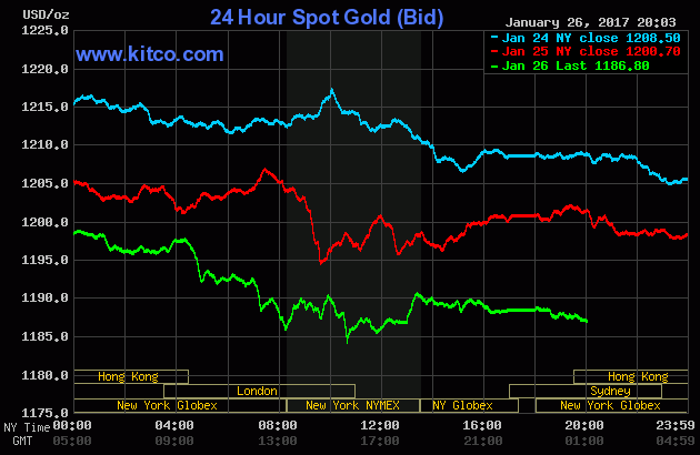 Tới đầu giờ sáng 27/1 (giờ Việt Nam), giá vàng thế giới giao ngay đứng ở mức 1.188,5 USD/ounce, giảm 9 USD so với phiên liền trước. Giá vàng giao tháng 2 trên sàn Comex New York giảm 8,2 USD/ounce xuống 1.189,6 USD/ounce.