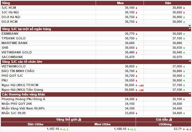 Tập Đoàn Vàng bạc đá quý DOJI niêm yết giá vàng SJC ở mức: 36,75 triệu đồng/lượng (mua vào) và 36,90 triệu đồng/lượng (bán ra). Công ty vàng bạc đá quý Sài Gòn niêm yết vàng SJC ở mức: 36,10 triệu đồng/lượng (mua vào) và 36,82 triệu đồng/lượng (bán ra).