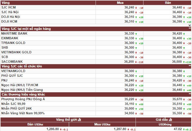 Công ty vàng bạc đá quý Sài Gòn niêm yết giá vàng SJC ở mức 36,24 triệu đồng/lượng (mua vào) và 36,46 triệu đồng/lượng (bán ra), giảm 10 ngàn đồng ở cả 2 chiều mua vào và bán ra so với chiều ngày 17/8.