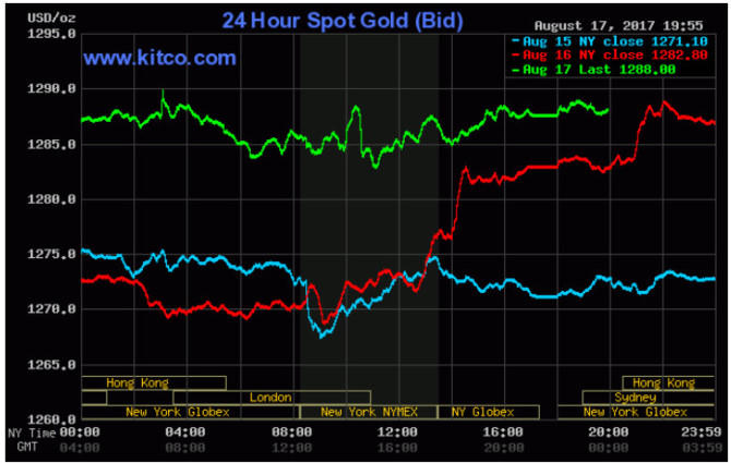 Ở thời điểm cập nhật lúc 7h00 sáng theo giờ Việt Nam, giá vàng giao ngay đang ở mức 1.288 USD/ounce, tăng so với mức chốt phiên hôm thứ Tư là 1.282,80 USD/ounce. Giá vàng giao tháng 12 trên sàn Comex New York lên 1.291,5 USD/ounce.