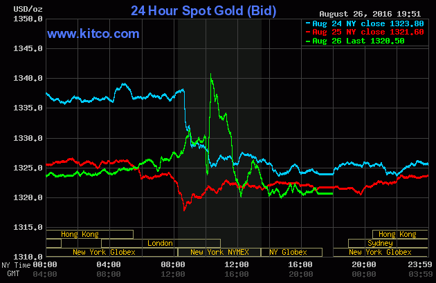 Sáng nay 7:00 theo giờ Việt Nam, giá vàng giao ngay trên sàn Kitco đứng tại 1.320,5USD/oz, giảm 0,08% so với chốt phiên trước. Đồng USD biến động mạnh sau bài phát biểu của Chủ tịch Cục dự trữ liên bang (Fed) Janet Yellen tại Jackson Hole.
