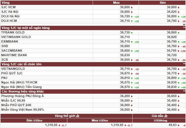 Cùng thời điểm này, Tập đoàn DOJI niêm yết giá vàng 36,70 – 36,78 triệu đồng/lượng (mua vào – bán ra). So với phiên trước, giá vàng được điều chỉnh giảm 70.000 đồng/lượng ở chiều bán ra, 20.000 đồng/lượng ở chiều mua vào. Mức chênh lệch giá bán đang cao hơn giá mua 80.000 đồng/lượng.