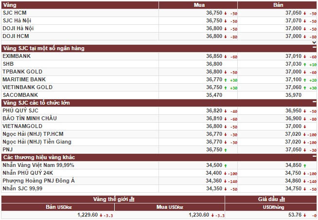 Tập đoàn DOJI niêm yết giá vàng sáng nay ở mức 36,80 – 37 triệu đồng/lượng (mua vào – bán ra). So với phiên trước, giá vàng được điều chỉnh giảm 100.000 đồng/lượng ở cả hai chiều mua – bán. Mức chênh lệch giá bán chỉ cao hơn giá mua 200.000 đồng/lượng.