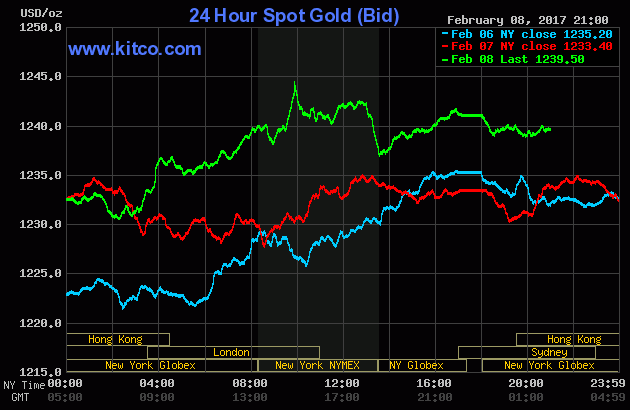 Tới đầu giờ sáng 9/2 (giờ Việt Nam), giá vàng thế giới giao ngay đứng ở mức 1.239,9 USD/ounce, tăng 6,5 USD so với phiên liền trước. Giá vàng giao tháng 4 trên sàn Comex New York tăng 5,7 USD/ounce lên 1.241,8 USD/ounce.