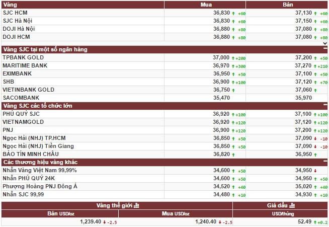 Công ty vàng bạc đá quý Sài Gòn niêm yết ở mức 36,87 triệu đồng/lượng (mua vào) và 37,19 triệu đồng/lượng (bán ra), tăng 100 ngàn đồng/lượng ở cả 2 chiều mua vào và chiều bán ra so với cuối giờ chiều ngày 8/2.