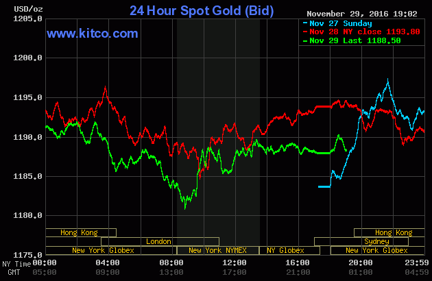 Tính tới 5h10 sáng 30/11 (giờ Việt Nam), giá vàng giao ngay đứng ở mức 1.187,9 USD/ounce sau một phiên giảm sâu trên thị trường Mỹ trước đó. Đêm qua, giá vàng có lúc giảm xuống sát 1.180 USD/ounce.
