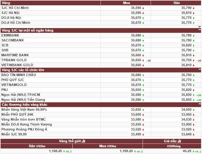 Công ty vàng bạc đá quý Sài Gòn niêm yết vàng SJC ở mức: 35,59 triệu đồng/lượng (mua vào) và 35,81 triệu đồng/lượng (bán ra).