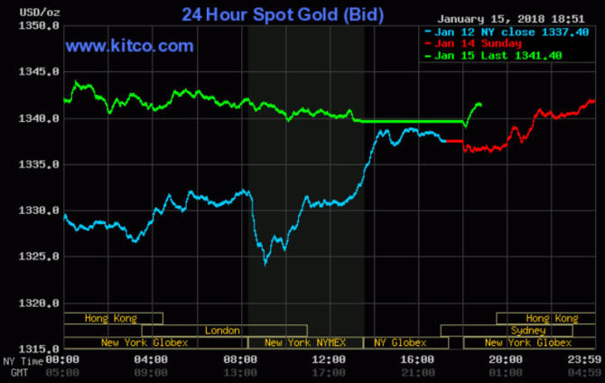 Ở thời điểm cập nhật lúc 7h00 sáng theo giờ Việt Nam, giá vàng giao ngay đang ở mức 1.341,40 USD/ounce, tăng 0,3% so với mức chốt phiên hôm thứ Sáu là 1.337,40 USD/ounce. Giá vàng giao tháng 2 trên sàn Comex New York đứng ở mức 1.342,4 USD/ounce.