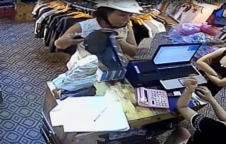 Trong khi nhân viên Hà đang thanh toán còn Huyền bỏ quần áo vào túi cho khách thì người phụ nữ này quan sát xung quanh, thấy một chiếc điện thoại iPhone 5 để trên bàn quầy thanh toán. Nhận túi quần áo từ nhân viên, người phụ nữ này để chiếc túi lại trên bàn bên cạnh chiếc Iphone nhằm che khuất điện thoại rồi nhanh tay kẹp theo chiếc điện thoại cùng túi bóng và bỏ vào túi.