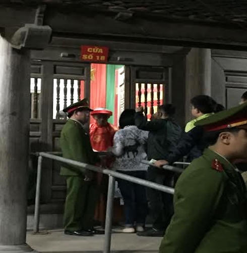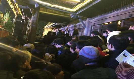 | Lực lượng giữ gìn trật tự lễ hội có một đêm làm việc vất vả giữa hàng người ken kín sân đền (Ảnh: Đ.Anh) |
