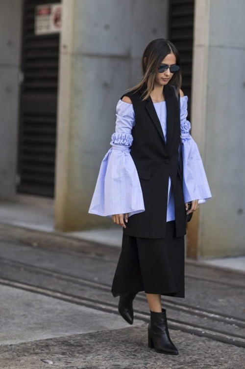Cá tính hơn, các cô gái có thể mặc áo tay chuông trễ vai với gilet là một ý tưởng táo bạo của những cô nàng cá tính muốn trải nghiệm item này.