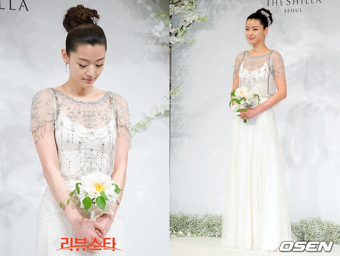 Ji Huyn xuất hiện một mình trong buổi họp báo trước lễ cưới. Cô diện đầm Jenny Packham vừa lộng lẫy vừa thanh giản. Trong hôn lễ chính thức, thương hiệu Reem Acra giúp nữ diễn có diện mạo “công chúa”. Váy cưới Reem Acra cúp ngực ngang và đôi cánh tay được cắt ngắn với chất liệu trong suốt thêu đính lấp lánh. Chiếc váy này có giá khoảng 1,6 tỷ đồng.