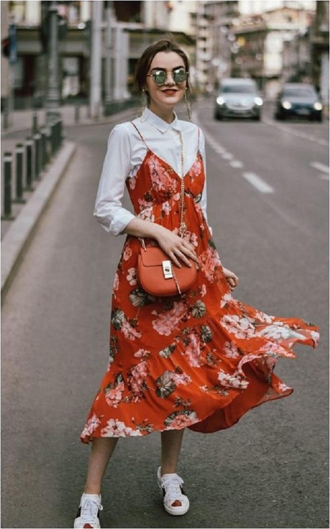 Nếu bạn không muốn khoe thân quá nhiều có thể chọn mix váy hai dây cùng áo thun và đừng quên sneaker để hoàn thiện phong cách, bắt kịp xu hướng hè năm nay.