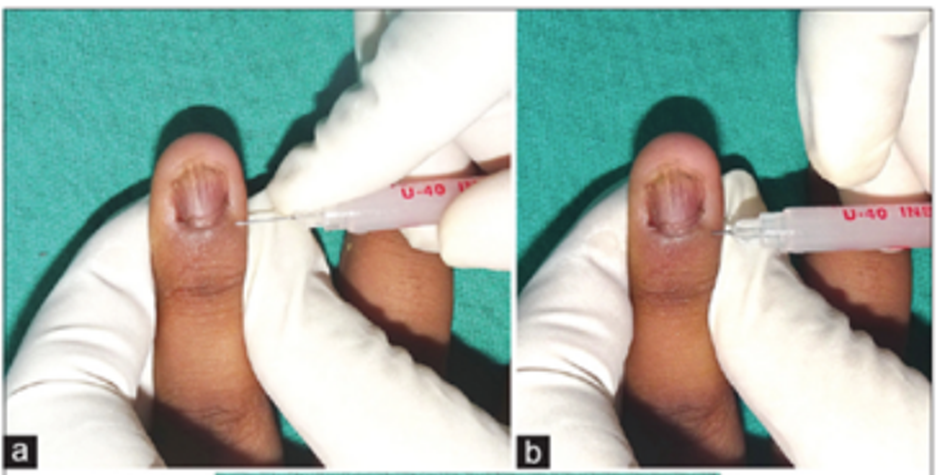Khi tiêm thuốc cần tiêm vào 4 vị trí: 2 vị trí vào mầm móng và 2 vị trí giường móng. Hiệu quả thuốc tiêm tuy ngắn hơn nhưng lại an toàn hơn so với dùng thuốc bôi kéo dài. Tuy nhiên, do các thụ thể thần kinh ở ngón tay rất nhạy cảm nên khi tiêm có thể gây đau buốt như bị lật móng.