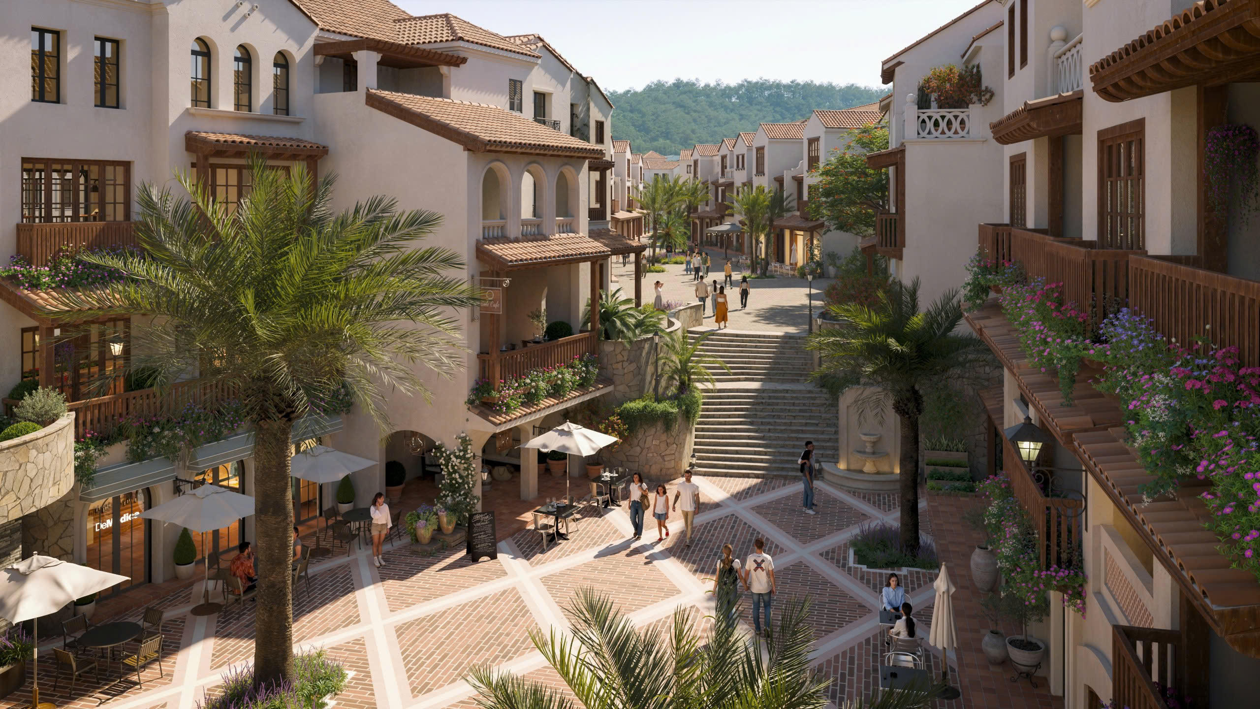 Với vai trò “phòng khách mở” của toàn thung lũng, Valley Town là nơi cộng đồng cư dân và du khách kết nối, giao lưu, sẻ chia sở thích và những ý tưởng kinh doanh sáng tạo. Những tuyến phố dạo bộ lát đá len lỏi khắp khu phố, dẫn lối dòng người qua từng dãy biệt thự, cửa tiệm, không gian dịch vụ... Tận dụng sự chênh lệch địa hình, đội ngũ kiến trúc sư khéo léo tạo nên quảng trường giật cấp Amor Steps, trở thành điểm check-in độc đáo tại Valley Town.