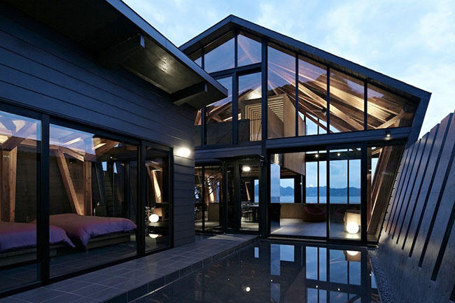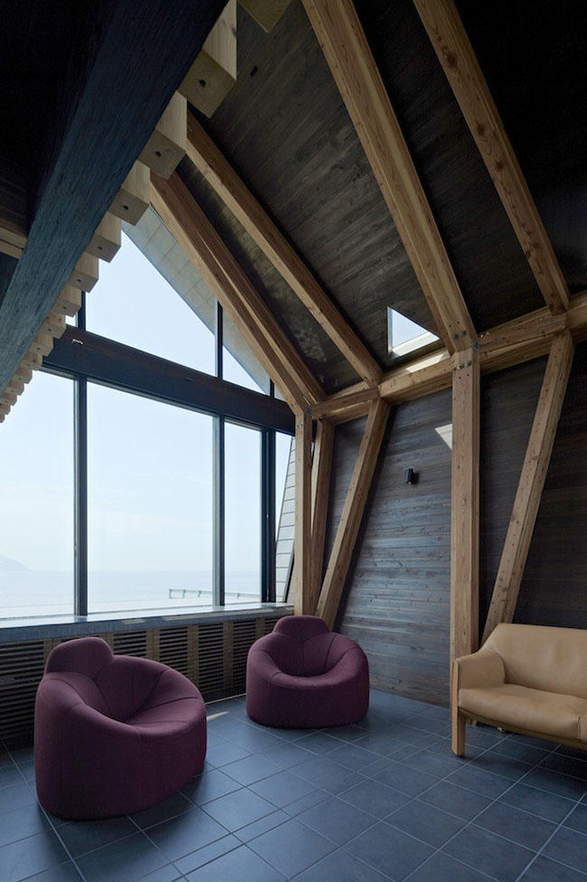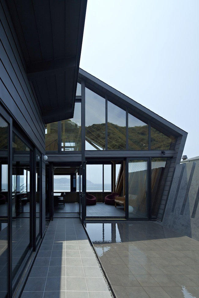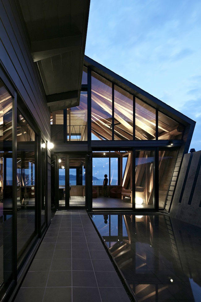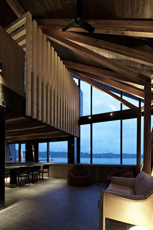 Biệt thự được xây dựng phần lớn bằng gỗ và vách ngăn cũng bằng gỗ được sử dụng để tạo ra một cấu trúc kết nối bề mặt hướng ra biển và các mặt hướng về phía núi.