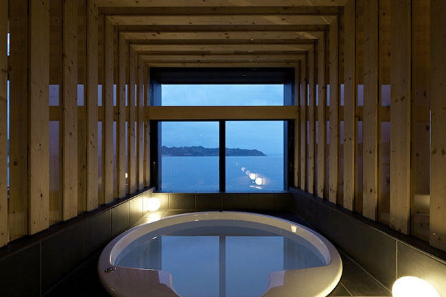Phòng tắm rộng rãi, với bồn tắm lớn có cửa sổ nhìn thẳng ra đại dương xanh mênh mông rất mát mắt.