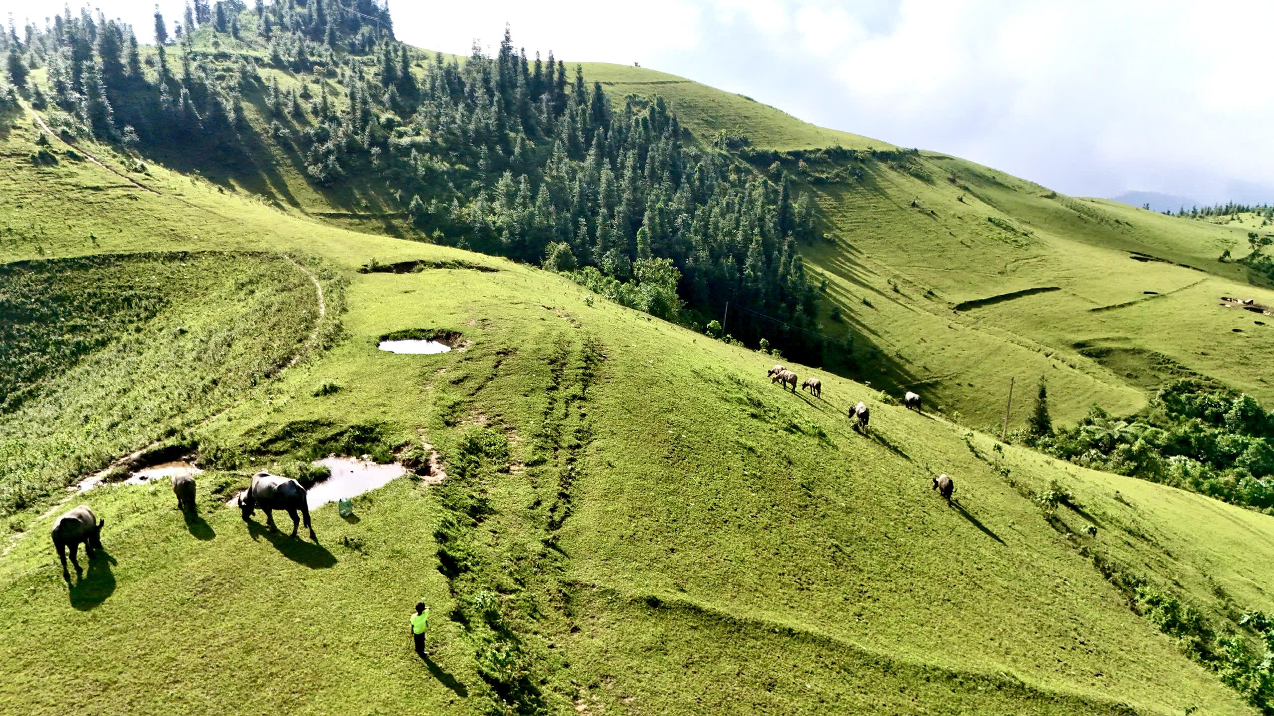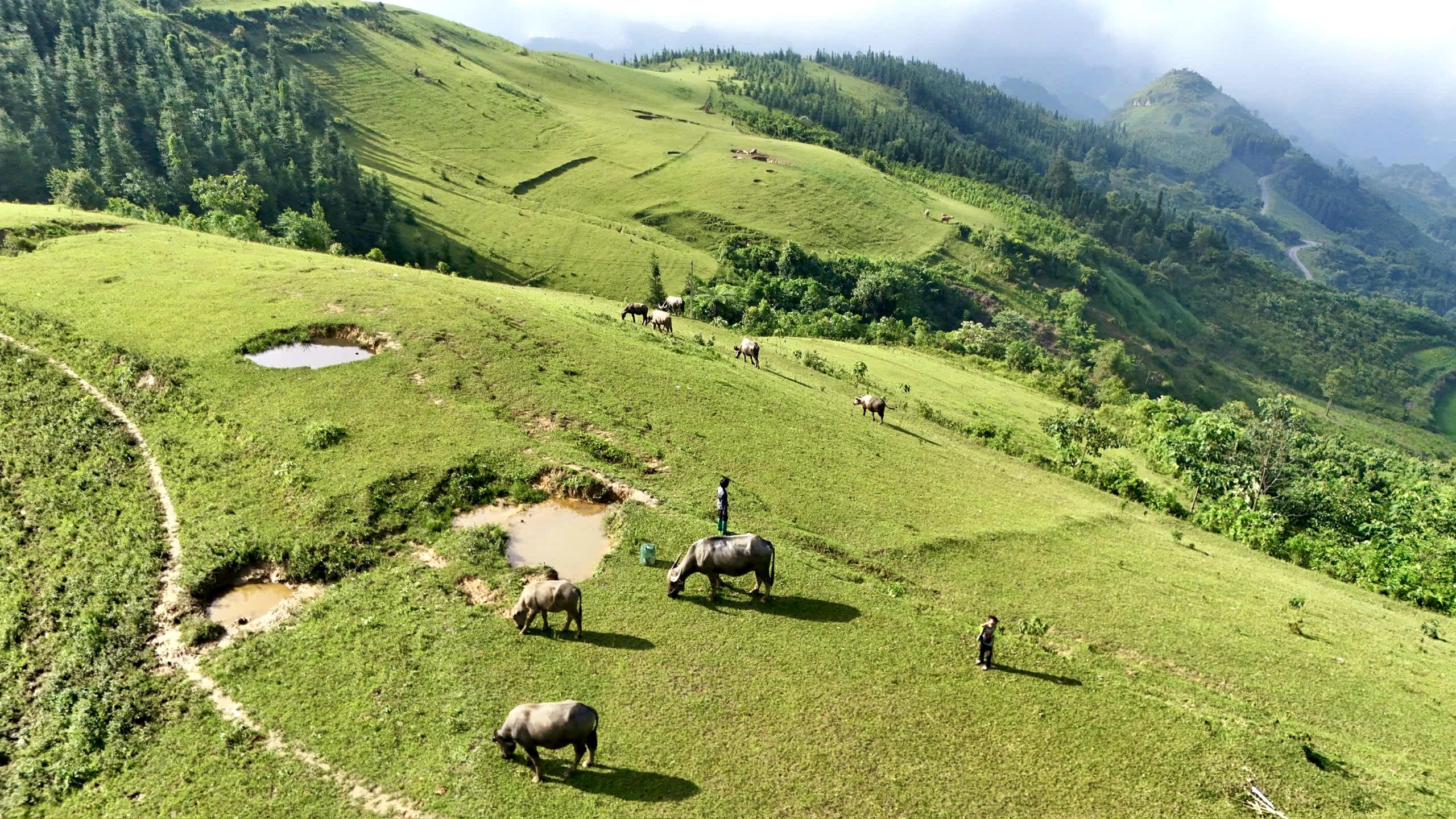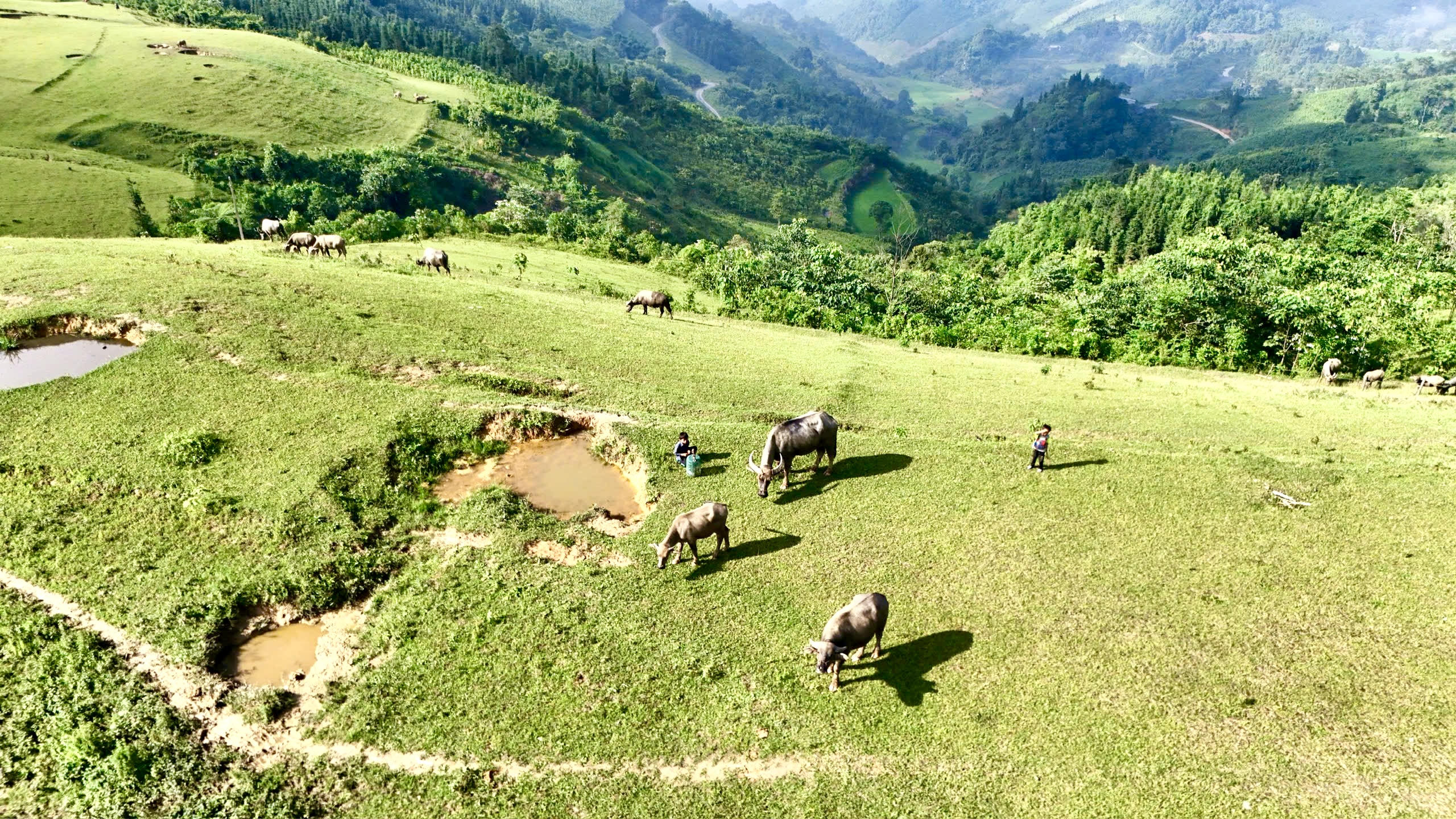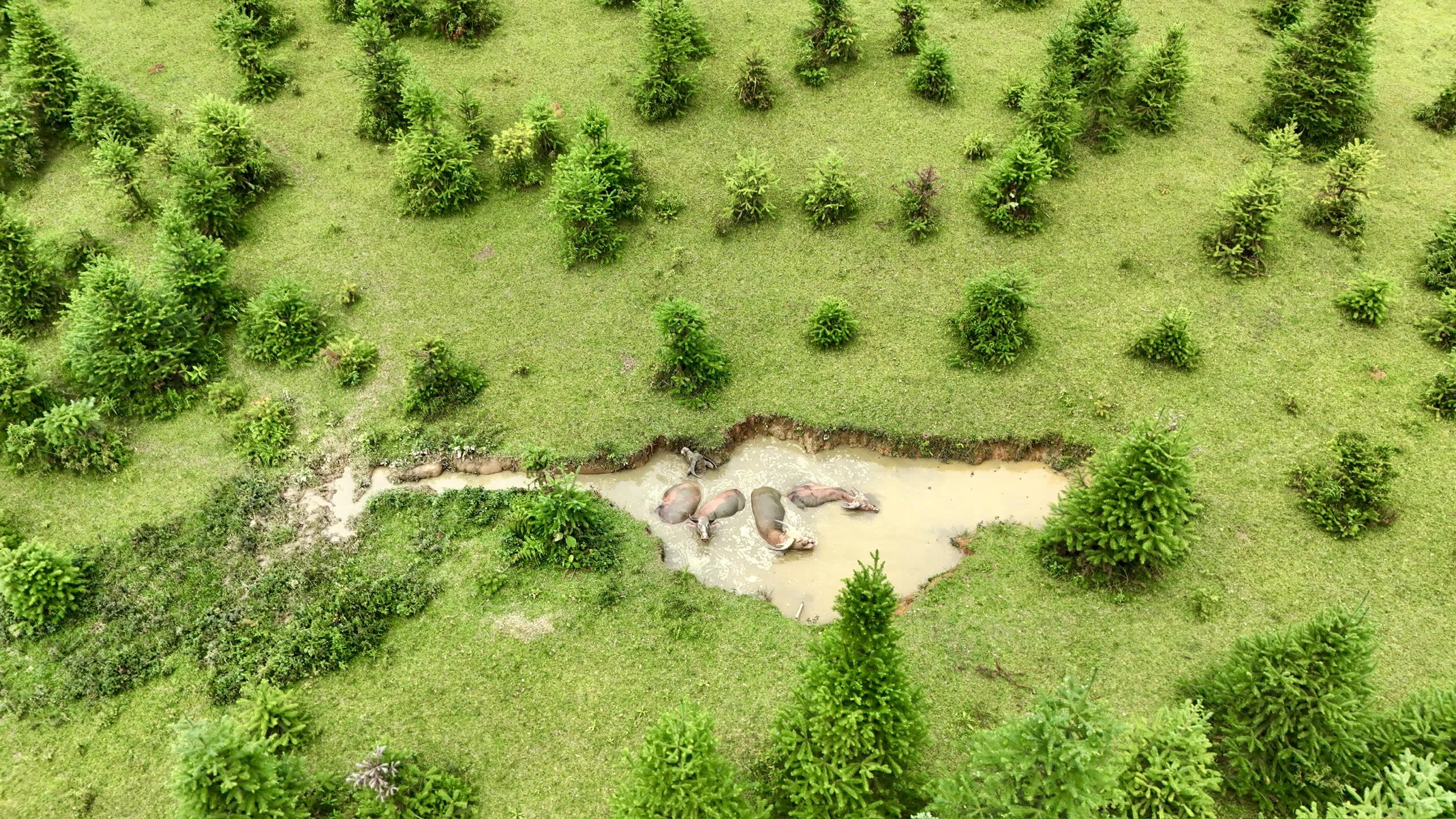 Những chú trâu được chăn thả trên cao nguyên, được ngâm mình dưới hố nước mát mẻ trong thời tiết nóng bức.