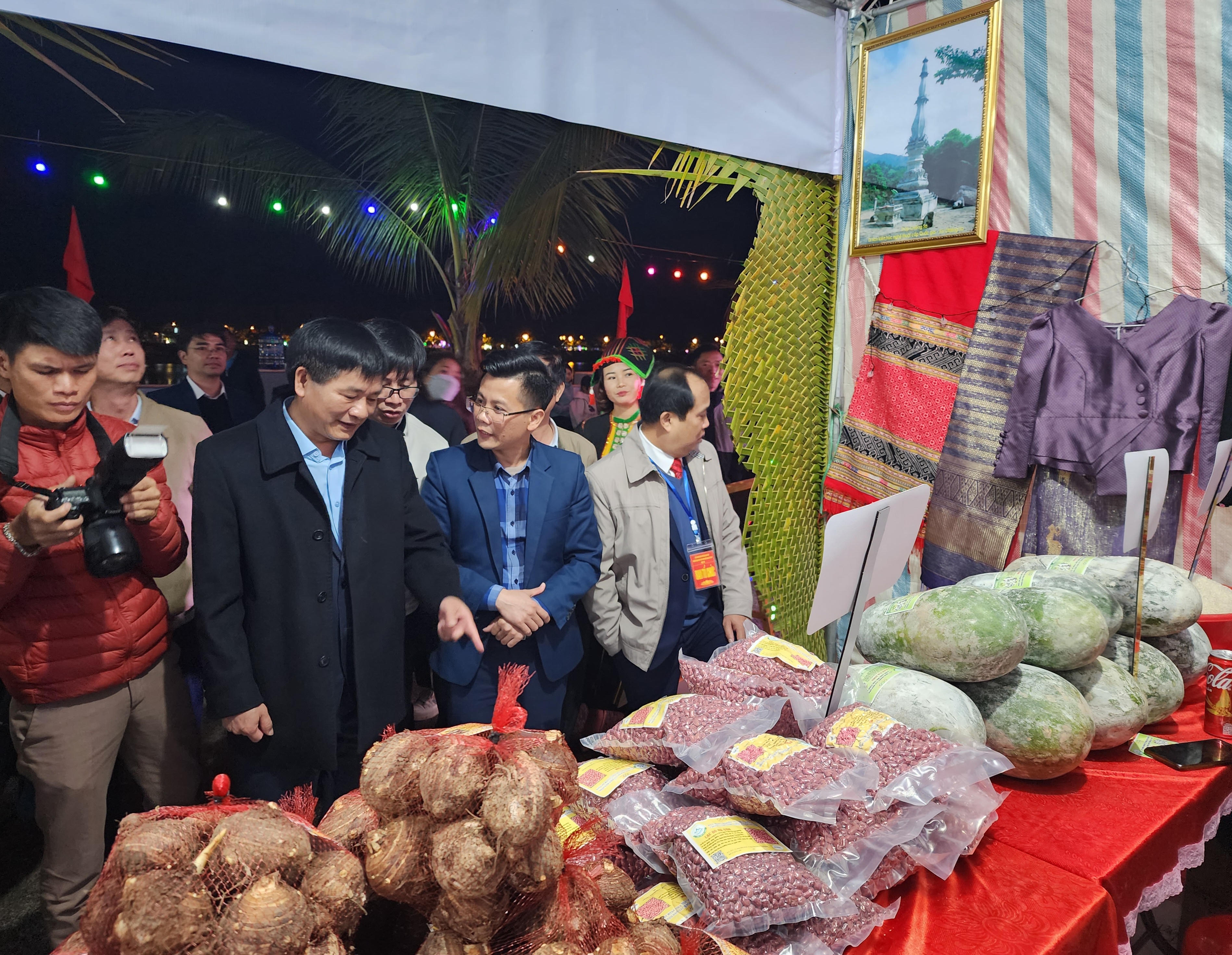 Cũng trong dịp này, Điện Biên cùng nhiều địa phương đã tổ chức trưng bày các sản phẩm nông nghiệp, đạt chuẩn OCOP. Chủ tịch UBND tỉnh Điện Biên Lê Thành Đô tham quan gian hàng trưng bày sản phẩm