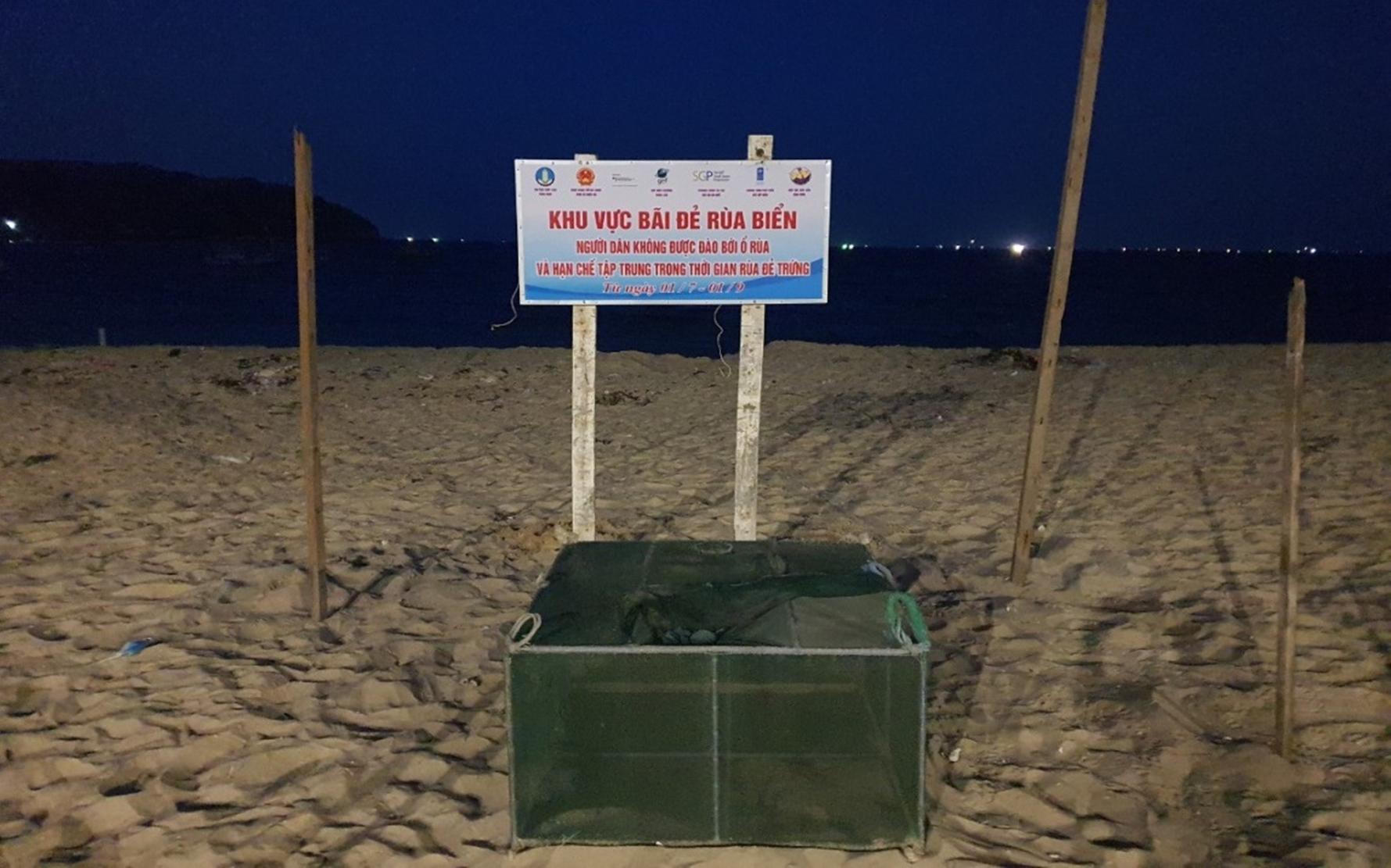 Cắm biển thông báo khu vực bãi đẻ của rùa để bảo vệ an toàn cho rùa. |
