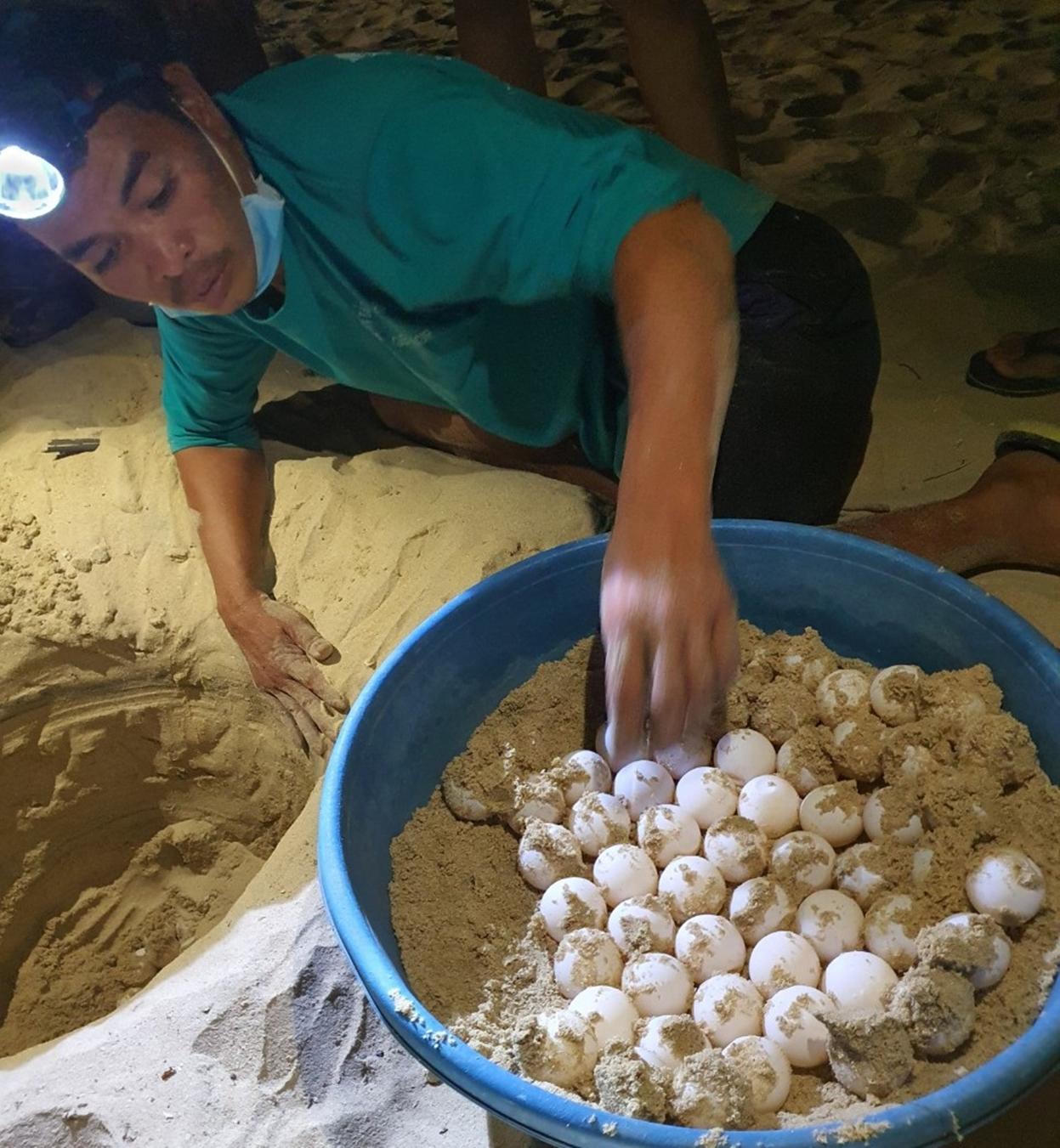 Anh Nguyễn Tôn Xuân Sáng di dời ổ trứng rùa đến nơi an toàn. |