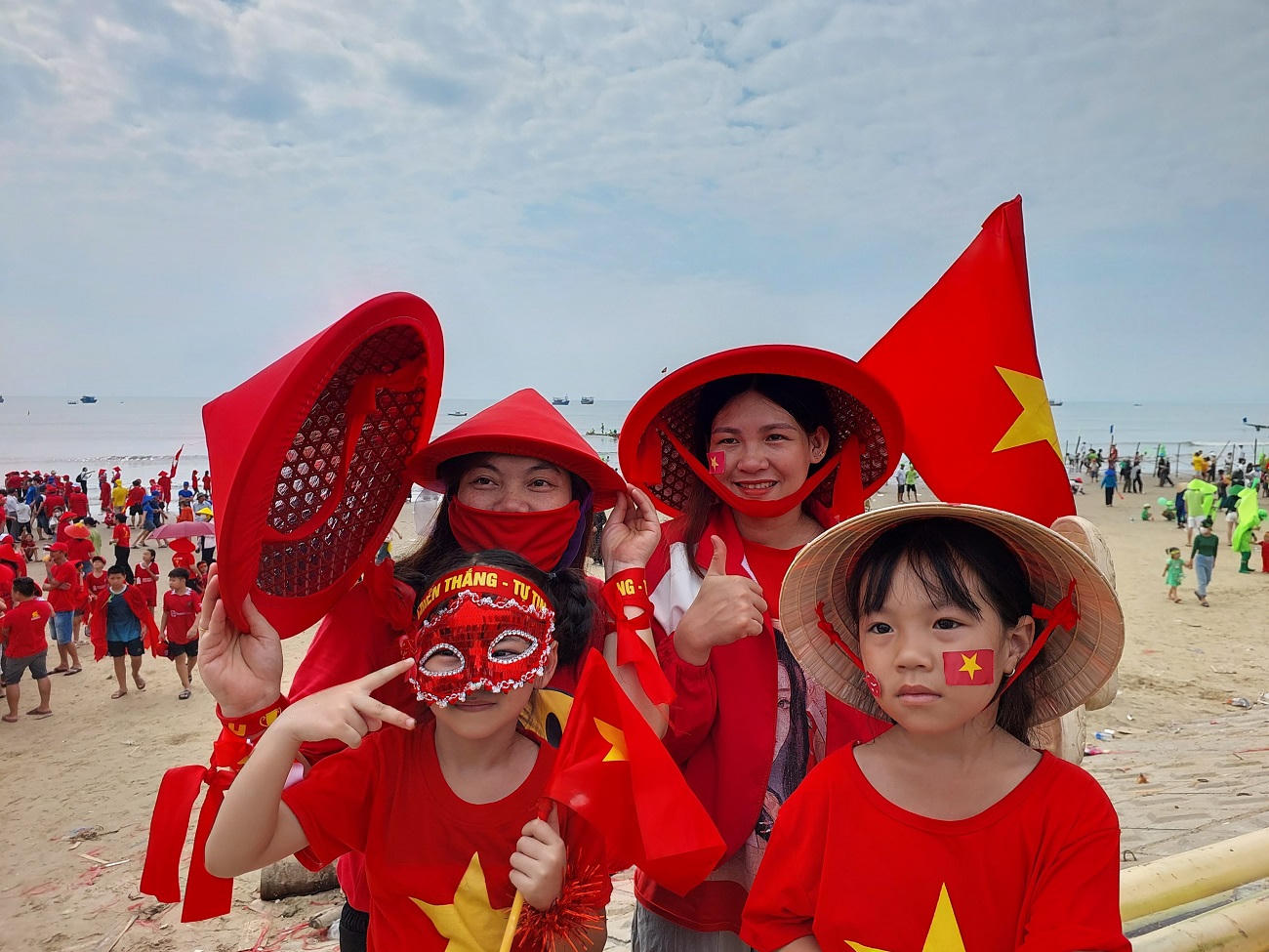 Cổ động viên đội Đỏ, tại lễ hội bơi thuyền truyền thống trên biển xã Cảnh Dương, huyện Quảng Trạch. |