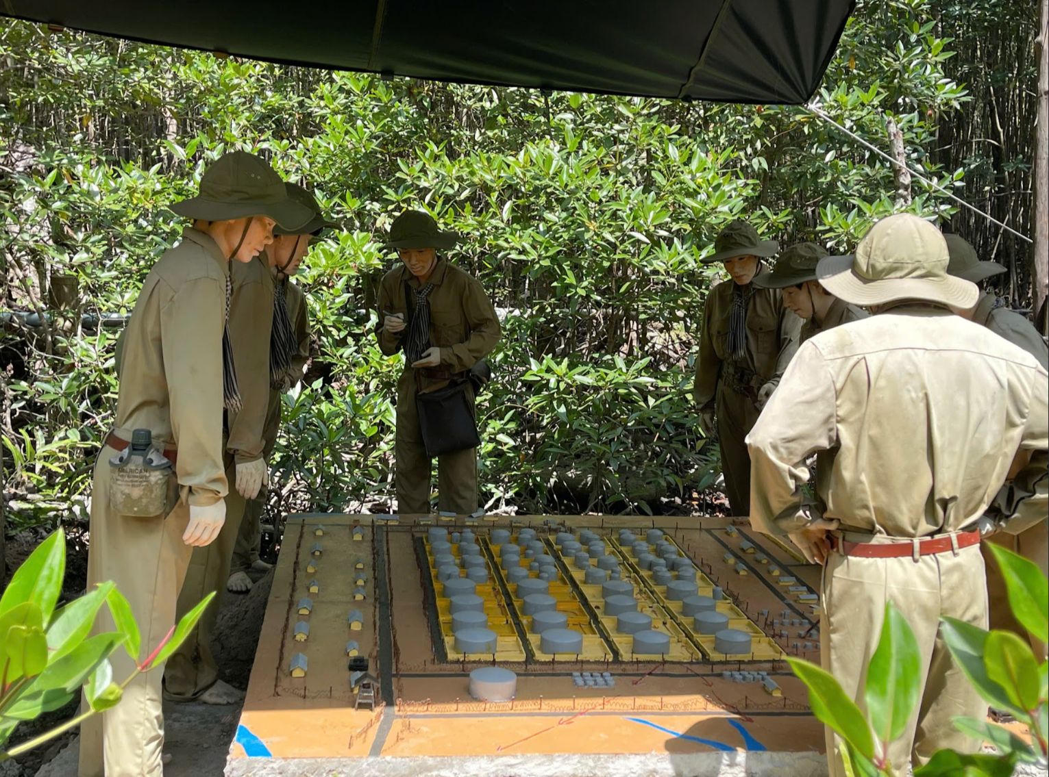 Mô hình các chiến sĩ đặc công Rừng Sác điều nghiên trên sa bàn Tổng kho xăng dầu Nhà Bè. |