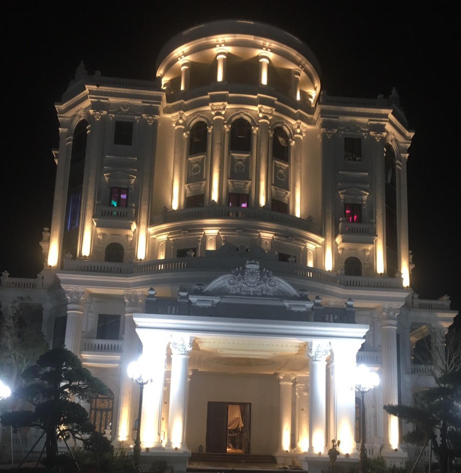 Bước qua dãy cổng dài hàng trăm mét, cao lừng lững được gắn hệ thống camera an ninh thông minh, đi vào phía trong khuân viên là hồ nước rộng, hệ thống cây cảnh lâu năm giá trị cao. Nội thất bên trong toà "lâu đài" chủ yếu là gỗ quý và đá nguyên khối được chuyển từ nhiều nơi trên cả nước về rất công phu, tốn kém. Phía bên trong 5 tầng nhà, chủ nhân sắp xếp bố trí cả thang máy, hệ thống âm thanh, ánh sáng hiện đại không kém gì những trường quay sang chảnh trong các đài truyền hình lớn.