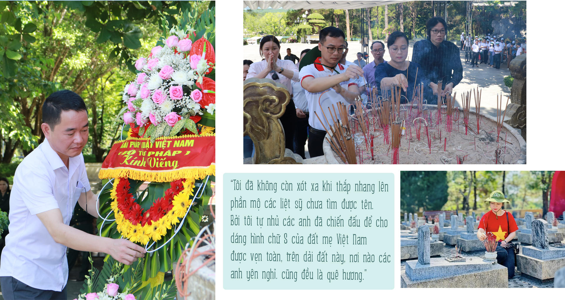 Chuyến đi lần này, tôi đã không còn bị choáng ngợp bởi hình ảnh hàng ngàn ngôi mộ nằm san sát, không còn xót xa khi thắp nhang lên phần mộ các liệt sỹ chưa tìm được tên. Bởi tôi tự nhủ các anh đã chiến đấu để cho dáng hình chữ S của đất mẹ Việt Nam được vẹn toàn, bởi thế, trên dải đất này, nơi nào các anh yên nghỉ cũng đều là quê hương.