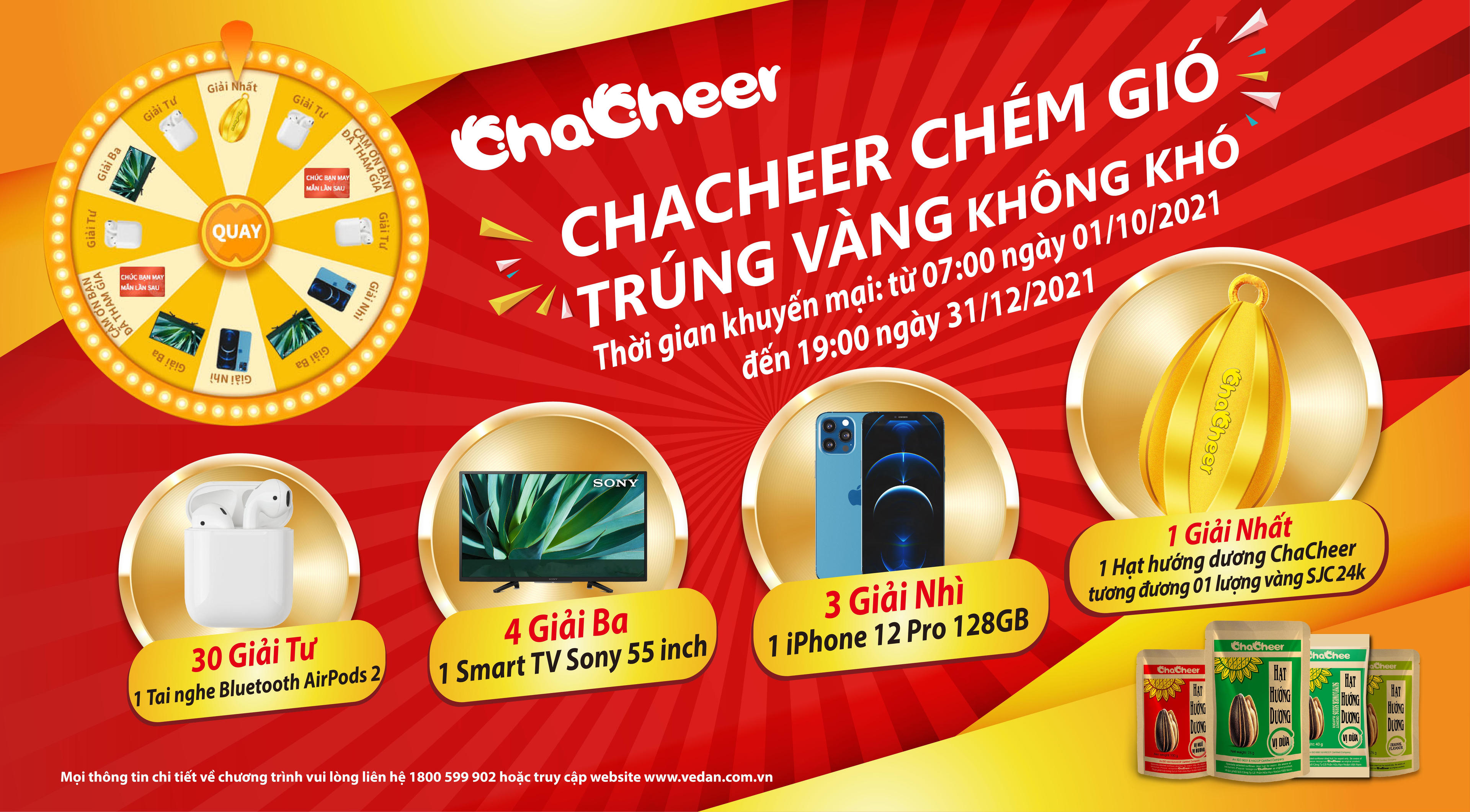 CHACHEER CHÉM GIÓ – TRÚNG VÀNG KHÔNG KHÓ là chương trình khuyến mãi bằng hình thức quét mã QR tham gia quay thưởng trên Website với nhiều giải thưởng hấp dẫn. Chương trình được áp dụng cho các sản phẩm: Hạt hướng dương ChaCheer vị dừa 40g, 75g và 130g; Hạt hướng dương ChaCheer nguyên vị 75g; Hạt hướng dương ChaCheer vị ngũ vị hương 130g.