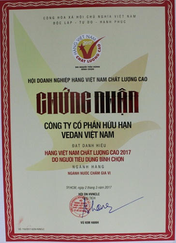 (PLO) - Ngày 2/3/2017, tại TP.Hồ Chí Minh, Hội Doanh nghiệp Hàng Việt Nam Chất lượng cao (HVNCLC) đã tổ chức Lễ công bố và trao chứng nhận cho 592 doanh nghiệp chính thức đạt Nhãn hiệu chứng nhận HVNCLC 2017. Công ty CP Hữu hạn Vedan Việt Nam với ngành hàng các sản phẩm gia vị (bột ngọt và hạt nêm Vedan) tiếp tục được người tiêu dùng tin yêu bình chọn là HVNCLC năm nay.