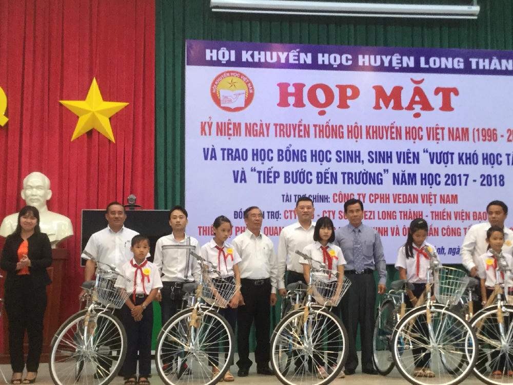 Chương trình trao học bổng cho học sinh, sinh viên nghèo năm nay, Hội Khuyến học huyện Long Thành đã trao tặng 130 suất học bổng, trong đó Vedan Việt Nam tặng hơn 100 suất học bổng và xe đạp trị giá từ 800 ngàn đồng đến 2 triệu đồng/suất cho các em học sinh, sinh viên có hoàn cảnh gia đình khó khăn, đạt thành tích học tập tốt trong năm học vừa qua, với tổng giá trị 100 triệu đồng. Đây sẽ là nguồn động viên khích lệ to lớn cả về vật chất và tinh thần, nhằm giúp cho nhiều em học sinh ở huyện Long Thành cố gắng hơn trong học tập, vươn lên trong cuộc sống trở thành con ngoan, trò giỏi, sớm giúp ích cho gia đình, xã hội.