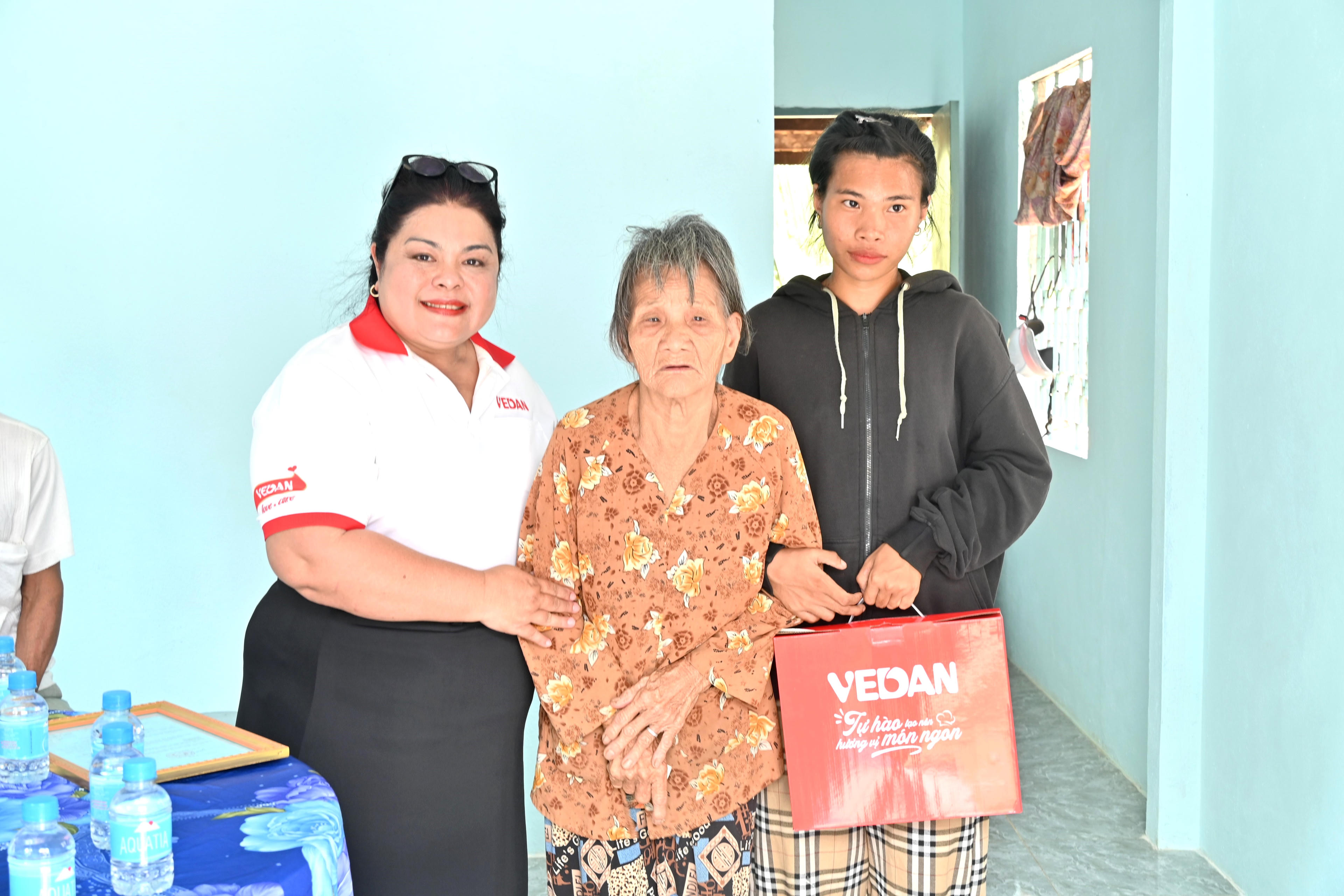 Bà Nguyễn Thu Thủy đại diện Vedan Việt Nam trao quà cho gia đình. |