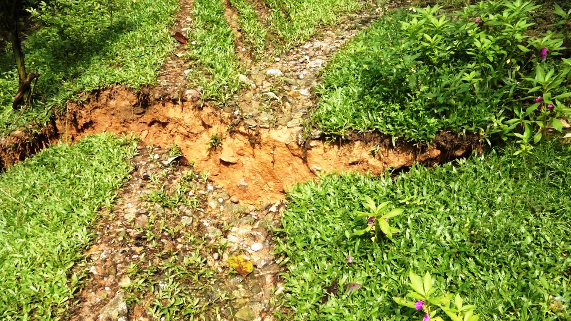 Ảnh hưởng của mưa lớn cũng đã khiến cho đất đá nhiều nơi sạt lở. Tại khu vực thôn 6 xã Trà Bui, đoạn đường bê tông liên thôn bị gãy ngang hơn 40m. Được biết, toàn thôn này có 278 hộ dân với 1.263 nhân khẩu, trong đó có 33 hộ dân thuộc diện di dời theo phương án của huyện.