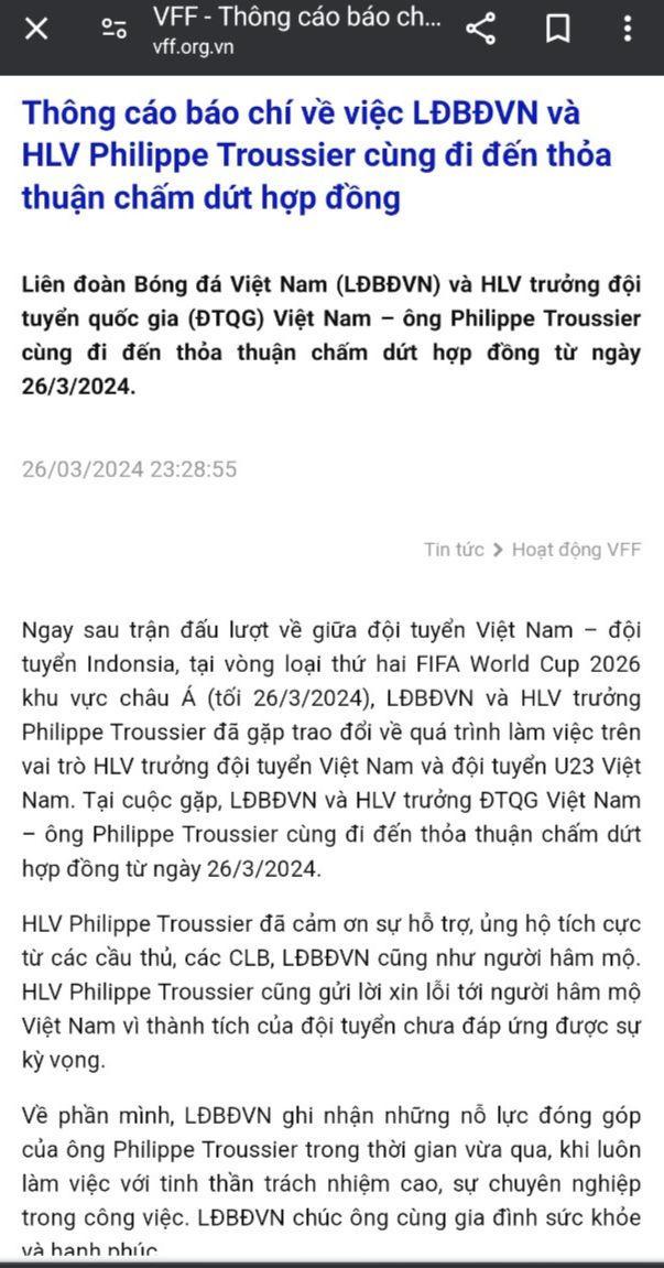 Ngay sau trận đấu lượt về giữa đội tuyển Việt Nam – đội tuyển Indonsia, tại vòng loại thứ hai FIFA World Cup 2026 khu vực châu Á (tối 26/3/2024), LĐBĐVN và HLV trưởng Philippe Troussier đã gặp trao đổi về quá trình làm việc trên vai trò HLV trưởng đội tuyển Việt Nam và đội tuyển U23 Việt Nam. Tại cuộc gặp, LĐBĐVN và HLV trưởng ĐTQG Việt Nam – ông Philippe Troussier cùng đi đến thỏa thuận chấm dứt hợp đồng từ ngày 26/3/2024.HLV Philippe Troussier đã cảm ơn sự hỗ trợ, ủng hộ tích cực từ các cầu thủ, các CLB, LĐBĐVN cũng như người hâm mộ. HLV Philippe Troussier cũng gửi lời xin lỗi tới người hâm mộ Việt Nam vì thành tích của đội tuyển chưa đáp ứng được sự kỳ vọng.Về phần mình, LĐBĐVN ghi nhận những nỗ lực đóng góp của ông Philippe Troussier trong thời gian vừa qua, khi luôn làm việc với tinh thần trách nhiệm cao, sự chuyên nghiệp trong công việc. LĐBĐVN chúc ông cùng gia đình sức khỏe và hạnh phúc.
