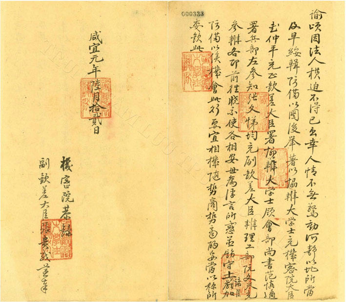 Bản Dụ Cần vương trong Châu bản triều Nguyễn đề ngày 12 tháng 6 năm Hàm Nghi nguyên niên (1885). (Nguồn: Trung tâm Lưu trữ quốc gia I - Châu bản triều Nguyễn) |