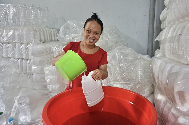 Hiện nay, chị Hồng đã mạnh dạn thử nghiệm và thành công với sản phẩm sinh học từ rác hữu cơ cùng với một số thảo dược khác để sản xuất ra các dòng sản phẩm như: nước rửa chén, nước giặt, dầu gội đầu, sữa tắm… bảo đảm vệ sinh môi trường, an toàn cho người sử dụng.