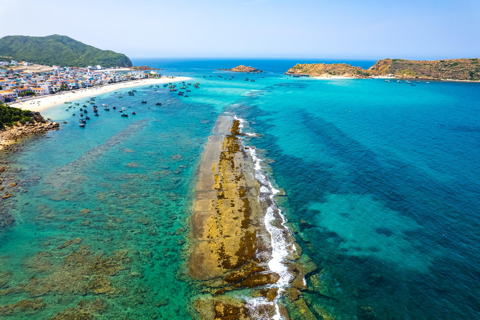 Ngoài ra, bãi biển Nhơn Hải mang hình cánh én lượn cùng sóng biển vỗ bờ sẽ khiến du khách không khỏi thích thú, choáng ngợp và không thể nào quên. Khi thủy triều cạn, dãy thành cổ Chăm Pa nhô cao trên mặt biển, du khách có thể nhờ ngư dân bơi thúng đưa mình ra biển để lên thành cổ. Dạo chơi, bắt ốc, câu cá… trên dãy thành cổ Chăm Pa là trải nghiệm cực lạ mà chỉ Nhơn Hải mới có.