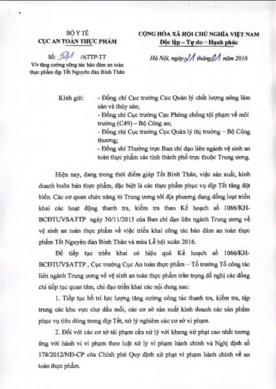 Trước thực tế này để tăng cường quản lý thực phẩm, đảm bảo an toàn thực phẩm Tết Bính Thân 2016, Cục trưởng Cục An toàn thực phẩm vừa có công văn đề nghị xử phạt vi phạm hành chính mức cao nhất đối với vi phạm an toàn thực phẩm nhiều lần, nghiêm trọng.