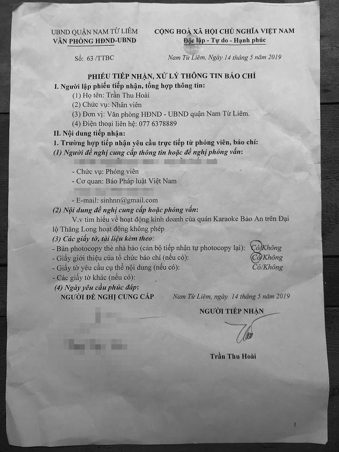 Việc vi phạm pháp luật của cơ sở Bảo An đã rõ “mười mươi”, việc cấp giấy phép hoạt động kinh doanh karaoke cho cơ sở này của UBND quận Nam Từ Liêm cũng đã được làm rõ các sai sót, vậy tại sao sau một thời gian dài báo chí phản ánh mà cơ quan này vẫn chưa xử lý và có câu trả lời chính thức?