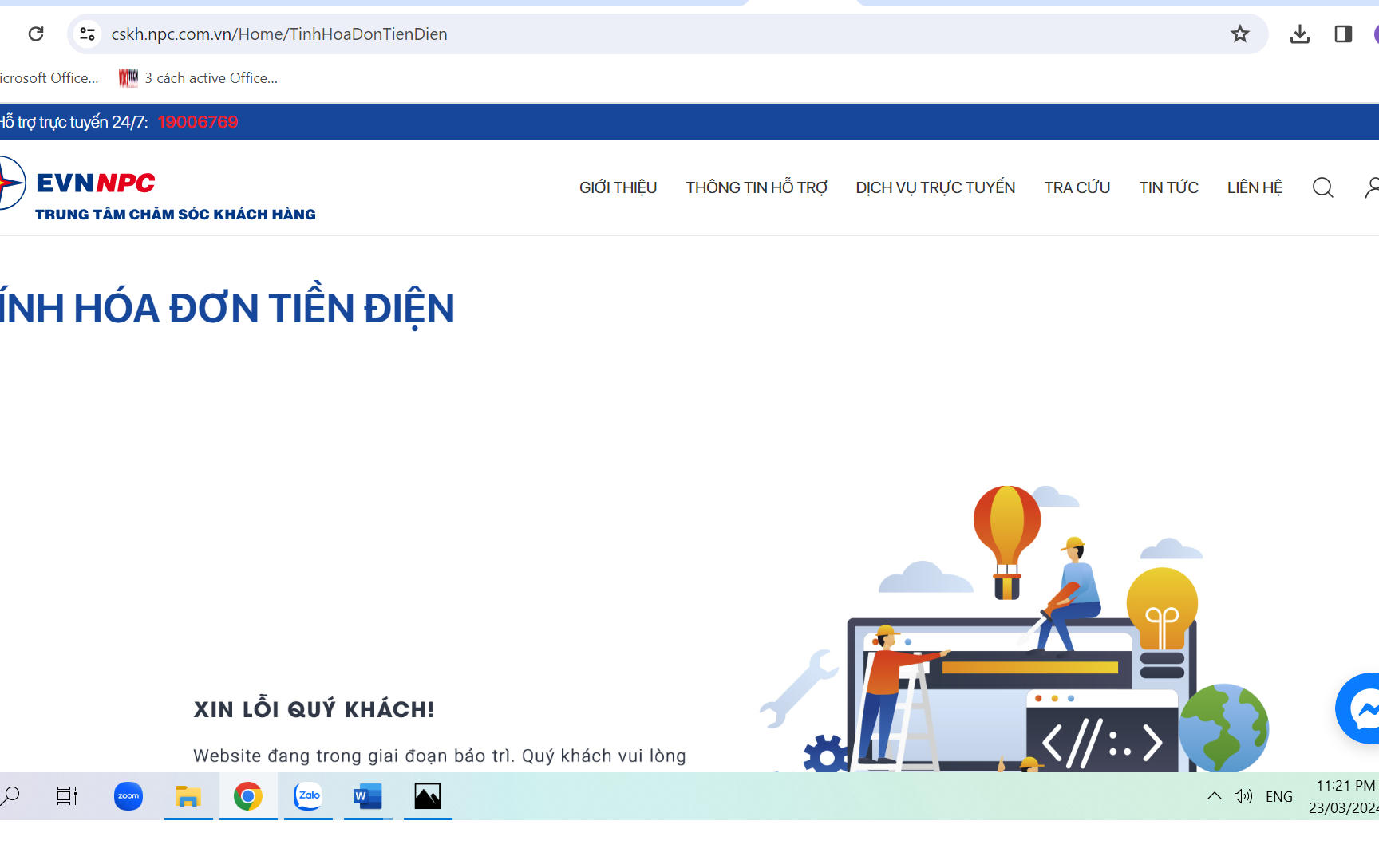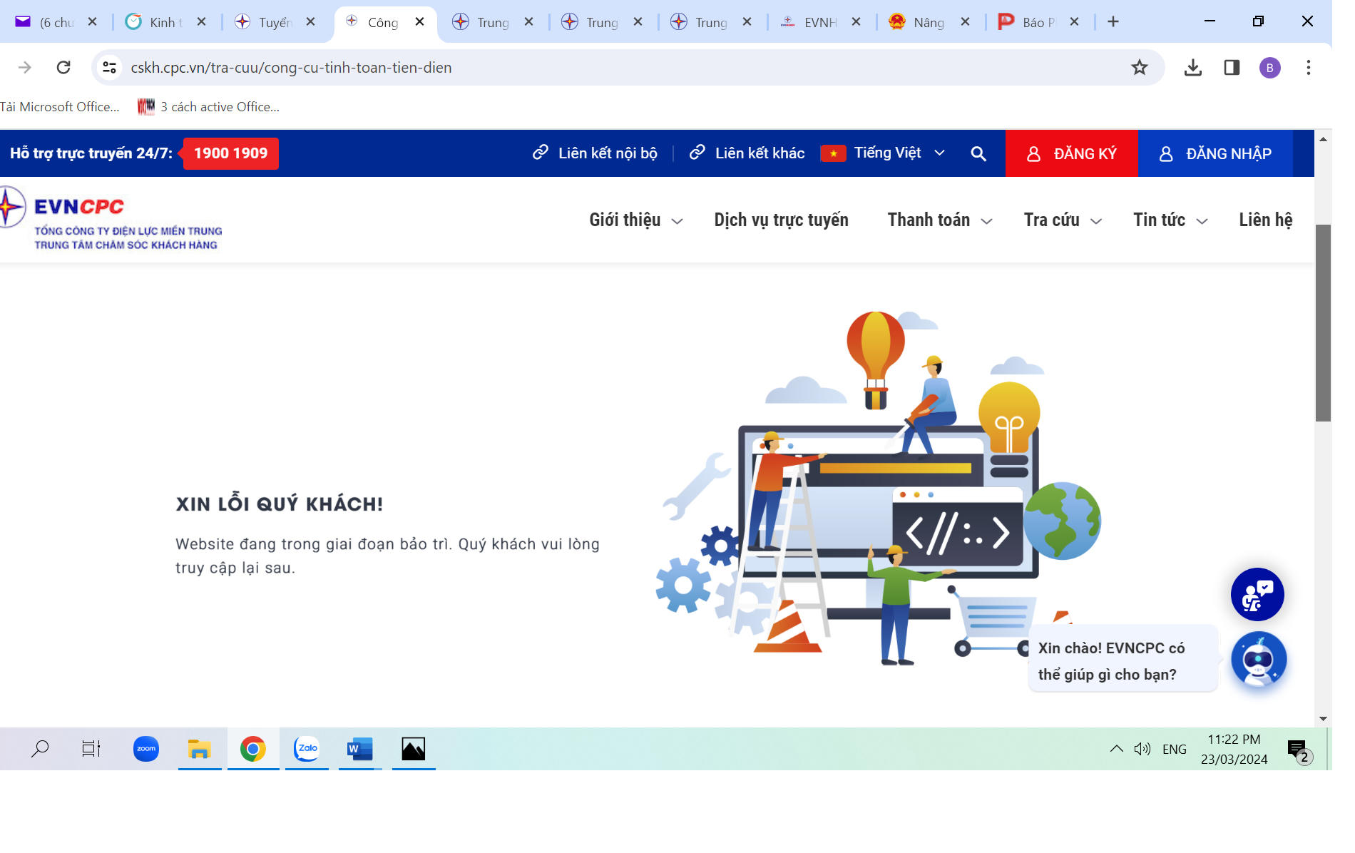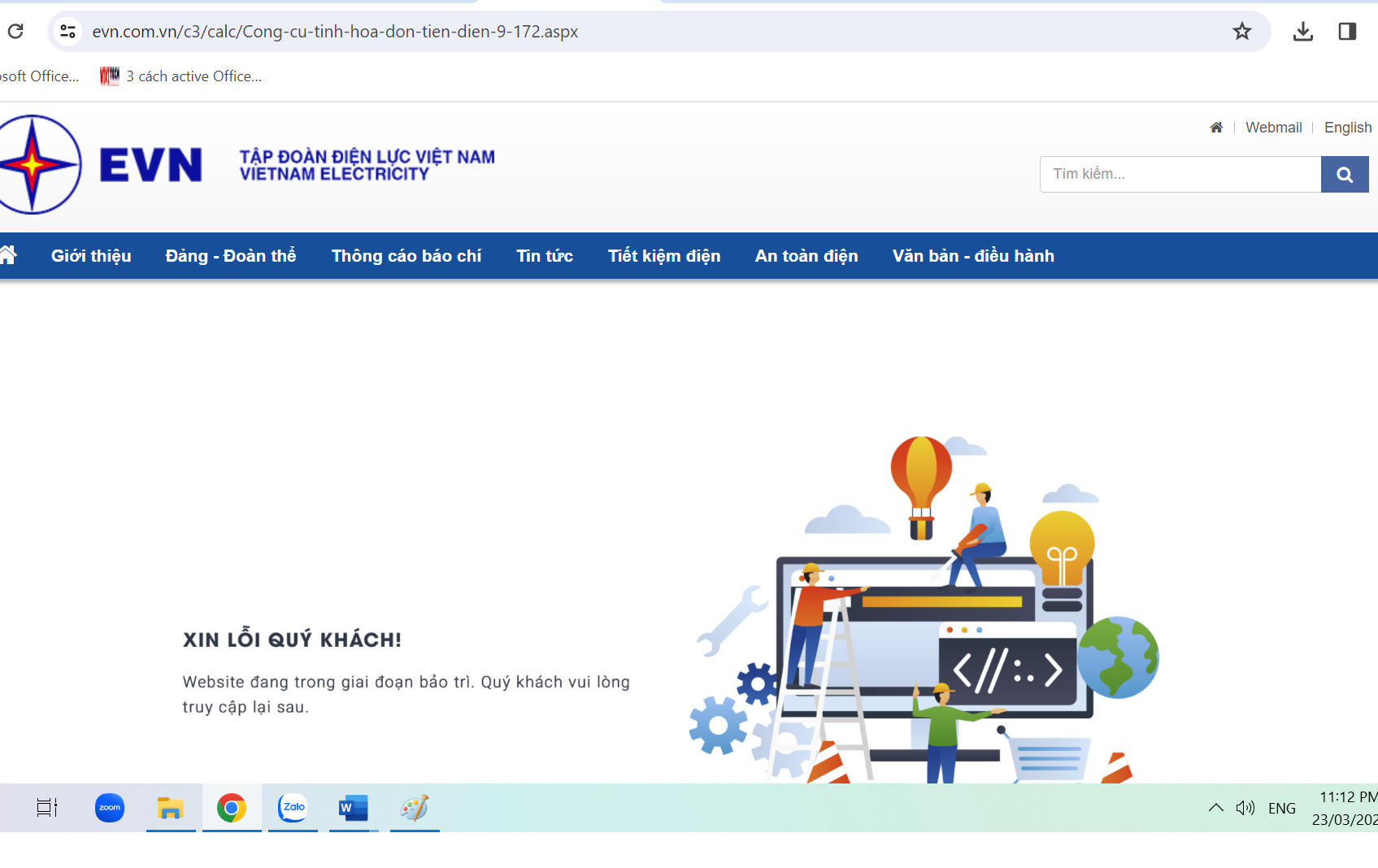 Tình trạng công cụ tính tiền điện của EVNSPC: "Xin lỗi quý khách! Website đang trong giai đoạn bảo trì. Quý khách vui lòng truy cập lại sau". |