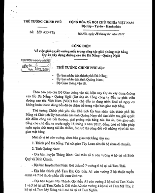 Thủ tướng Chính phủ yêu cầu Chủ tịch UBND TP Đà Nẵng và Chủ tịch UBND tỉnh Quảng Nam chỉ đạo kiểm tra, giải quyết dứt điểm công tác bồi thường, giải phóng mặt bằng của dự án, bàn giao mặt bằng cho chủ đầu tư trước ngày 15/3/2017, đồng thời có biện pháp ngăn ngừa tình trạng tái lấn chiếm, cản trở thi công đối với những vị trí đã bàn giao mặt bằng.