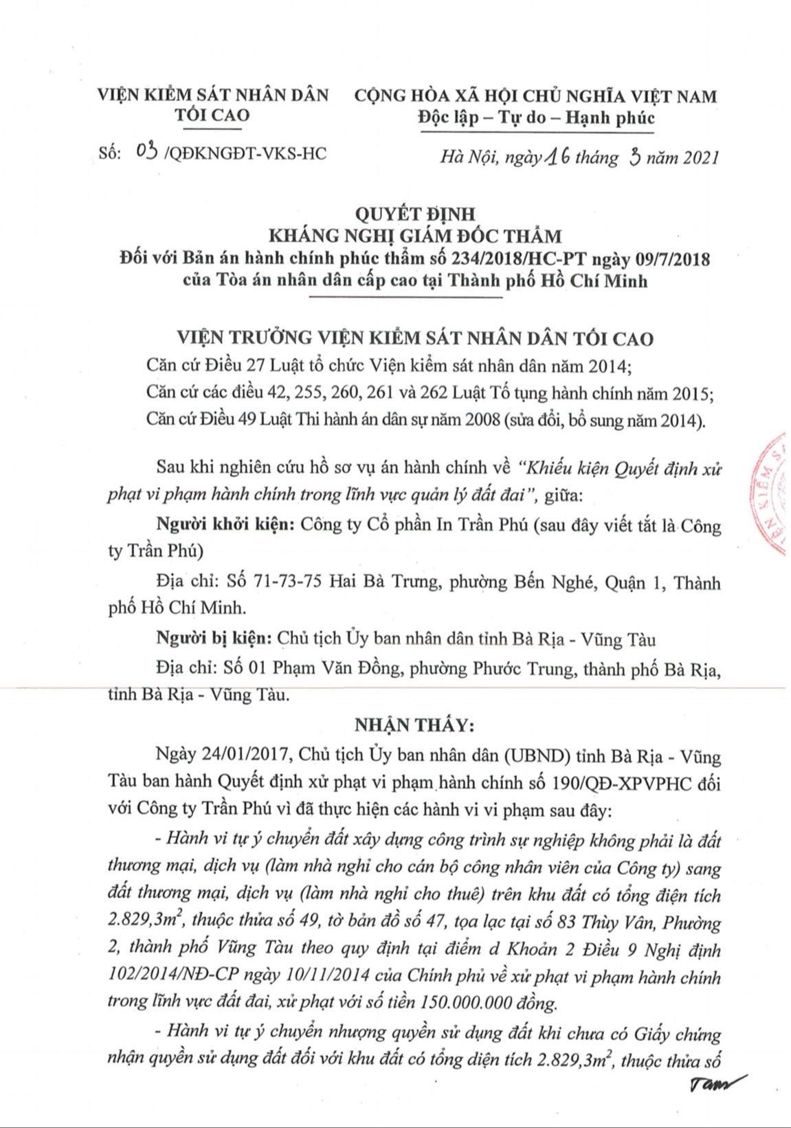 Quyết định kháng nghị Giám đốc thẩm số 03/QĐKMGĐT-VKS-HC có thể hiện “Thời điểm Đoàn thanh tra thuộc UBND tỉnh Bà Rịa – Vũng Tàu tiến hành thanh tra tại Công ty Trần Phú từ ngày 29/3/2016 đến 10/5/2016, hành vi tự ý chuyển nhượng quyền sử dụng khu đất số 83 Thùy Vân, Phường 2, TP Vũng Tàu của Công ty Trần Phú vẫn đang tồn tại”.