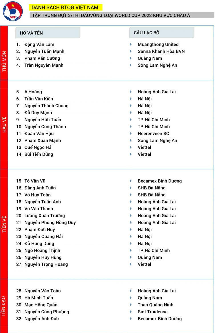 Danh sách chính thức 23 cầu thủ sẽ được chốt sát thời điểm ĐT Việt Nam gặp ĐT Malaysia trên Sân vận động Quốc gia Mỹ Đình tại vòng loại World Cup 2022 khu vực châu Á.