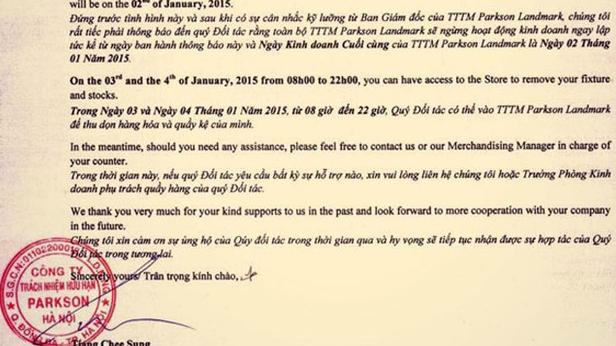 "Chúng tôi rất tiếc khi phải thông báo đến quý đối tác rằng toàn bộ TTTM Parkson Landmark sẽ ngừng hoạt động kinh doanh ngay lập tức kể từ ngày ban hành thông báo này và n gày kinh doanh cuối cùng của TTTM Parkson Landmark là ngày 02 tháng 01 năm 2015" - nội dung thông báo nêu rõ.