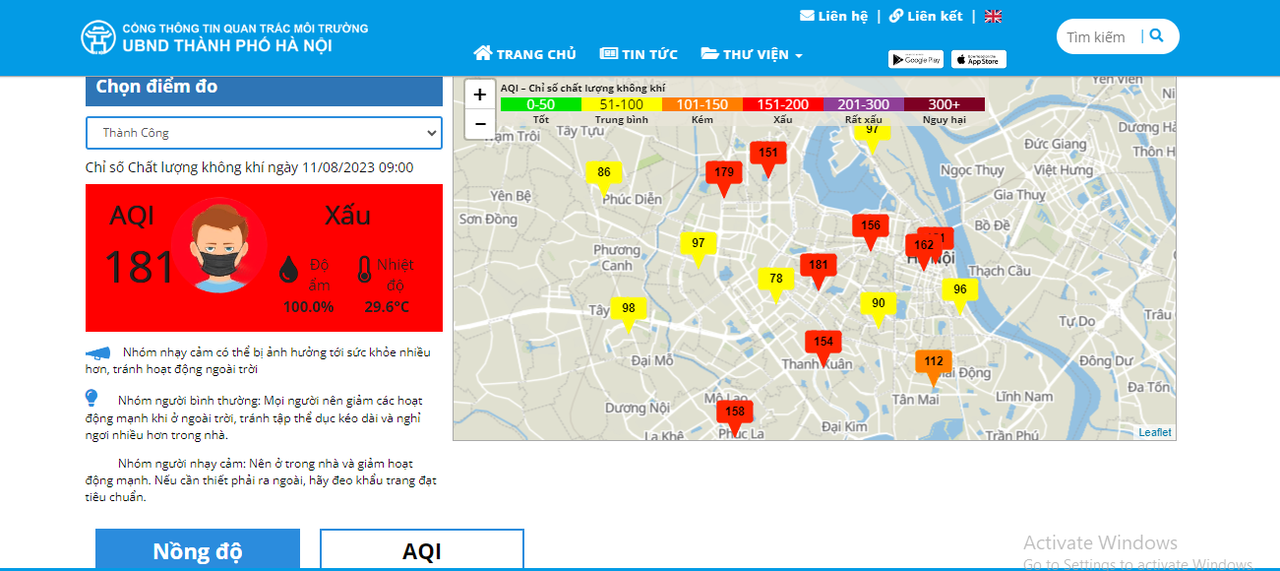 Còn cập nhật trên Cổng thông tin quan trắc môi trường, UBND TP Hà Nội cũng ghi nhận các điểm quan trắc lên ngưỡng cam, cá biệt có điểm đo lên ngưỡng đỏ như điểm đo tại Lê Trực (UBND phường Điện Biên, Ba Đình), điểm đo tại Thành Công (Công viên hồ Thành Công, Ba Đình), điểm đo tại Phạm Văn Đồng (36A Phạm Văn Đồng, Bắc Từ Liêm)…